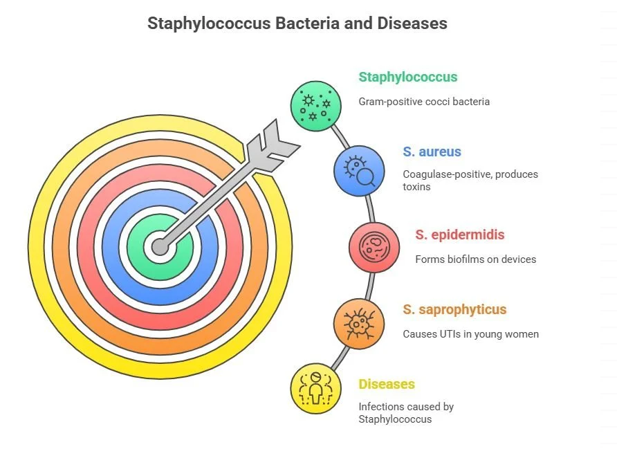 Classification & Morphology: Gram-positive cocci in clusters (like grapes). Catalase-positive (differentiates from Streptococcus). Staphylococcus aureus is coagulase-positive (forms clots), while Staphylococcus epidermidis and Staphylococcus saprophyticus are coagulase-negative.