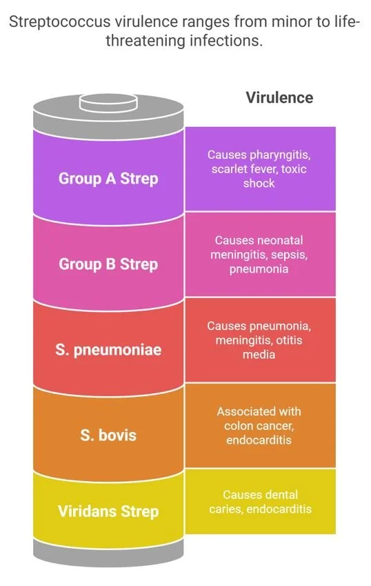 Classification & Morphology: Gram-positive cocci in chains. Catalase-negative (differentiates from Staphylococcus). Classified by hemolysis on blood agar (alpha, beta, gamma) and Lancefield grouping (based on carbohydrate antigens in cell wall).