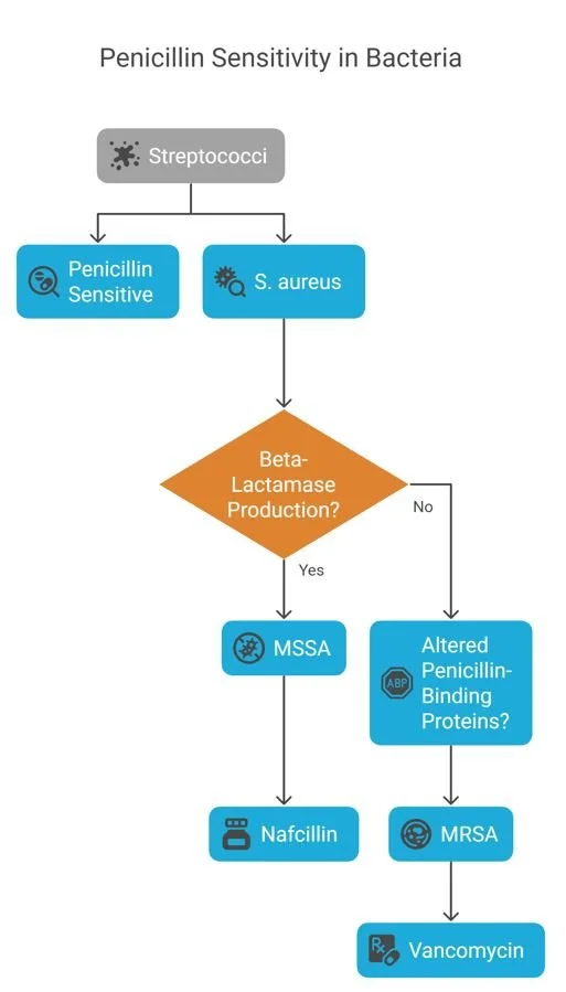 Penicillin Sensitivity: Most streptococci are highly sensitive to penicillin. However, S. aureus is often penicillin-resistant due to beta-lactamase production (methicillin-sensitive S. aureus - MSSA) or altered penicillin-binding proteins (methicillin-resistant S. aureus - MRSA). This highlights the importance of understanding antibiotic resistance mechanisms and choosing appropriate antibiotics (e.g., nafcillin for MSSA, vancomycin for MRSA).